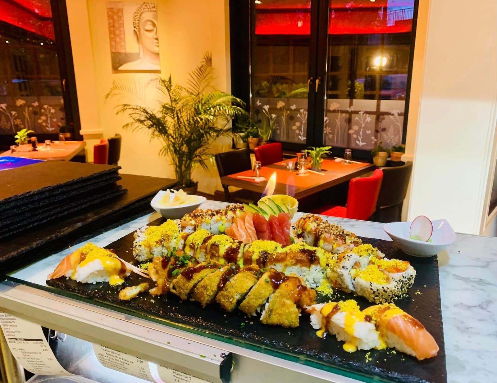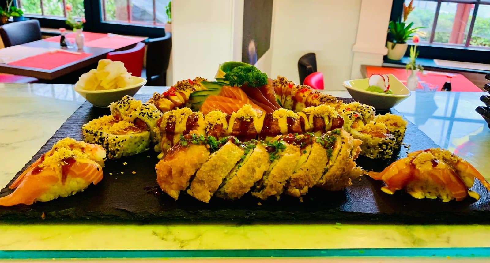 - mit norwegischem Lachs, Tempura Garnelen, gebrannten Mandeln, Mango, Aki Lachskaviar, Philadelphia, Yuzu, Lauchzwiebeln